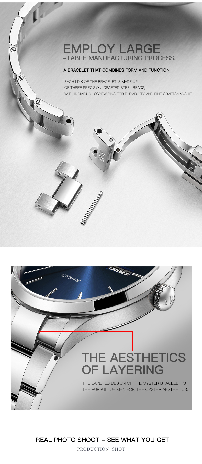 | Description | Case material: stainless steel Movement type: Miyota 8205/Seiko NH36 Dial diameter: 41mm Dial thickness: 11mm Clasp style: butterfly buckle Mirror material: synthetic sapphire Strap material: stainless steel | Case material: stainless steel Movement type: Dial diameter: 32mm Dial thickness: 8mm Buckle style: pin buckle Mirror material: synthetic sapphire Strap material: cowhide | ||||||||||||