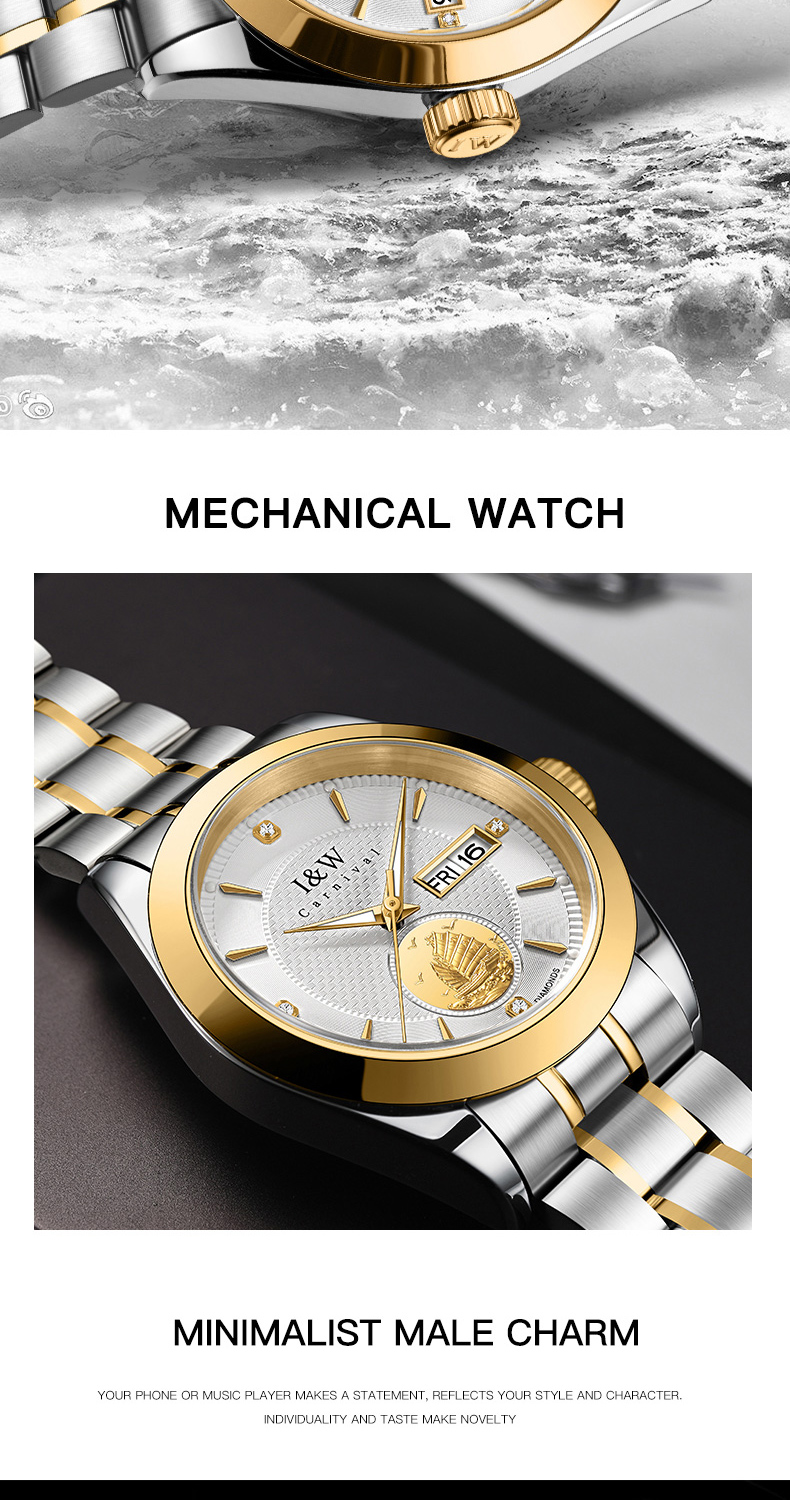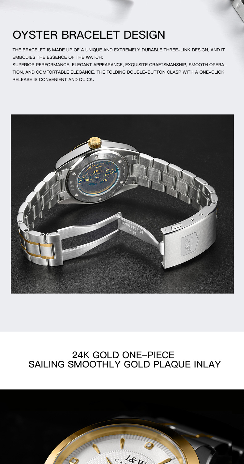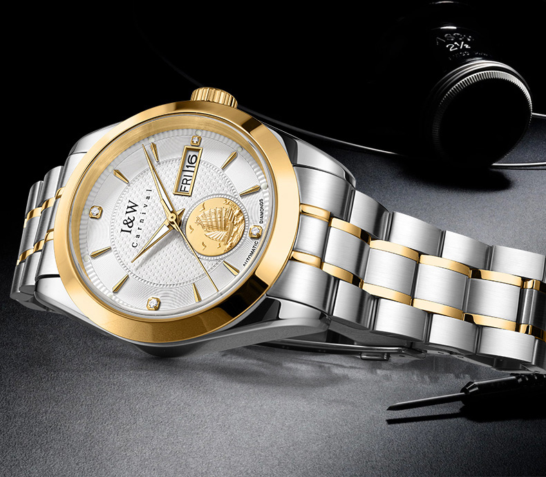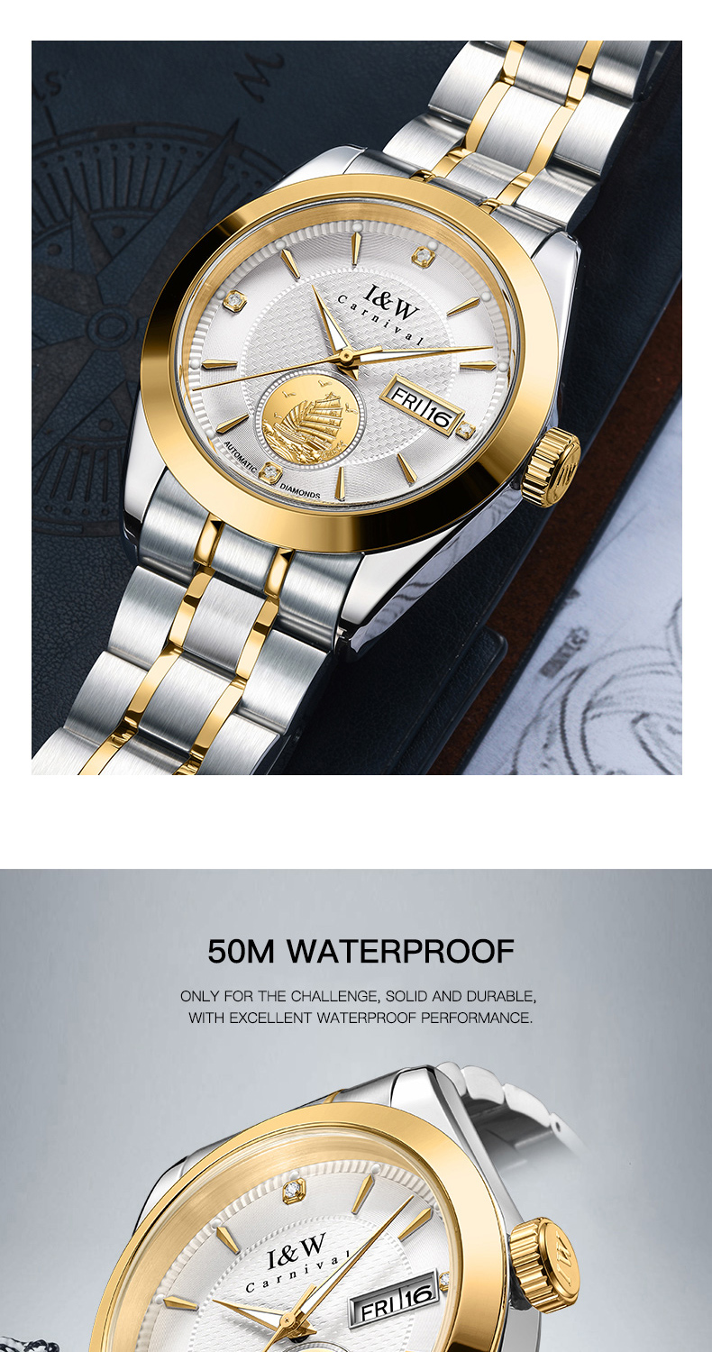IW.55808G I&W Voyager Series 24K Gold Sailboat Icon Business Watch with Genuine Diamonds and Engraved Dual Calendar Automatic Mechanical Watch Waterproof and Luminous