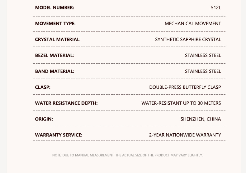 | Description | Case material: stainless steel Movement type: Dial diameter: 32mm Dial thickness: 8mm Buckle style: pin buckle Mirror material: synthetic sapphire Strap material: cowhide | Case material: stainless steel Movement type: Citizen 8205AAA Dial diameter: 41mm/36mm Dial thickness: 11mm Clasp style: butterfly buckle Mirror material: artificial sapphire Strap material: stainless steel | Case material: stainless steel Movement type: natural Miyuta 8205 gold Seiko NH36 Dial diameter: 42mm Dial thickness: 10.5mm Clasp style: butterfly buckle Mirror material: synthetic sapphire Strap material: stainless steel | |||||||||