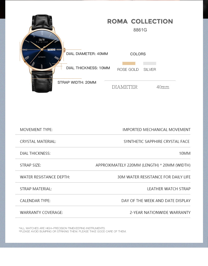 | Description | Case material: stainless steel Movement type: Miyota 8205/Seiko NH36 Dial diameter: 41mm Dial thickness: 11mm Clasp style: butterfly double snap Mirror material: synthetic sapphire Strap material: stainless steel | Case material: stainless steel Movement type: natural Miyuta 8205 gold Seiko NH36 Dial diameter: 42mm Dial thickness: 10.5mm Clasp style: butterfly buckle Mirror material: synthetic sapphire Strap material: stainless steel | ||||||||||